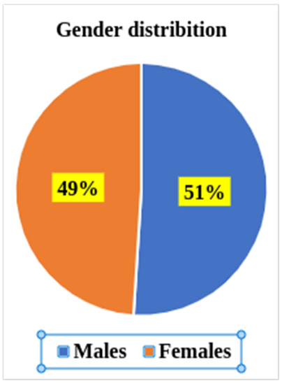 From the data analyzed, there is almost equal participation of both genders in this study i. e, Males–51%, Females–49% [table 1].