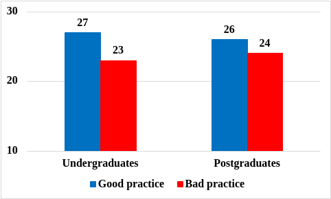 About 27 undergraduates (54%) and 26 postgraduates (52%) had shown moderate practice. About 76% of both the groups have an idea about the ADR monitoring center (AMC), located in the Department of Pharmacology, Government Medical College, Ananthapuramu.
