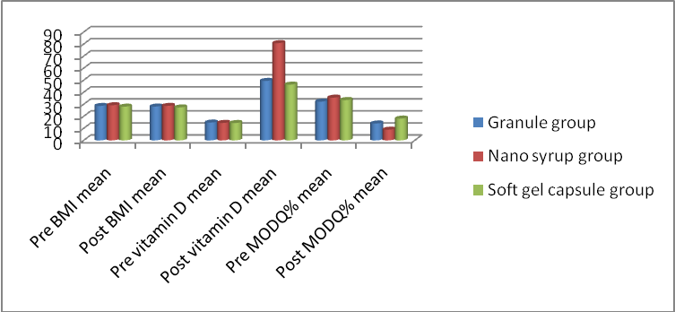 There was a significant difference in the Mean values of BMI (kg/m2) at baseline and after 12 w in all the 3 groups but a higher difference is seen in the Nano syrup group as shown in table 2. Also there was significant difference in pre and post mean±SD of vitamin D (ng/ml) in all three groups but highest increase of mean in vitamin D (ng/ml) was noted in Nano syrup group. mean±SD of Pre and post VAS and MODQ% was significant in all groups and highest improvement in the Nano syrup group.