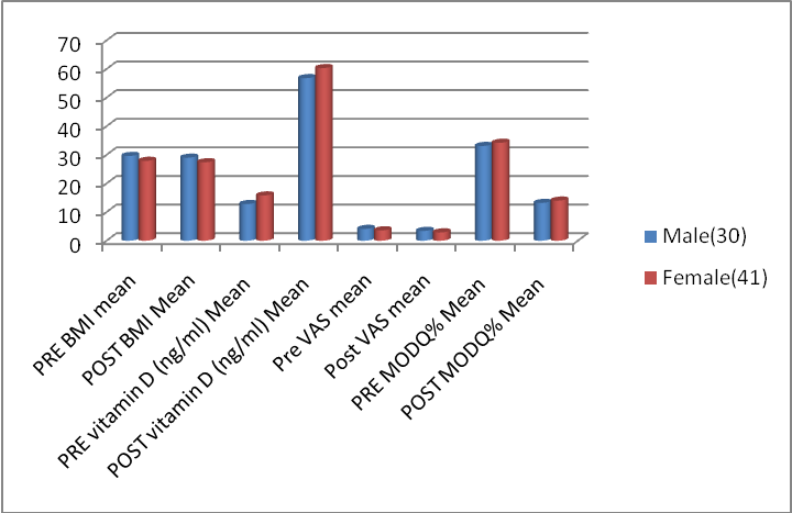 There was no significant difference in pre and post mean±SD of BMI (kg/m2) and vitamin D levels in male and female. There is not much difference in mean±SD of VAS and MODQ% of male and female.