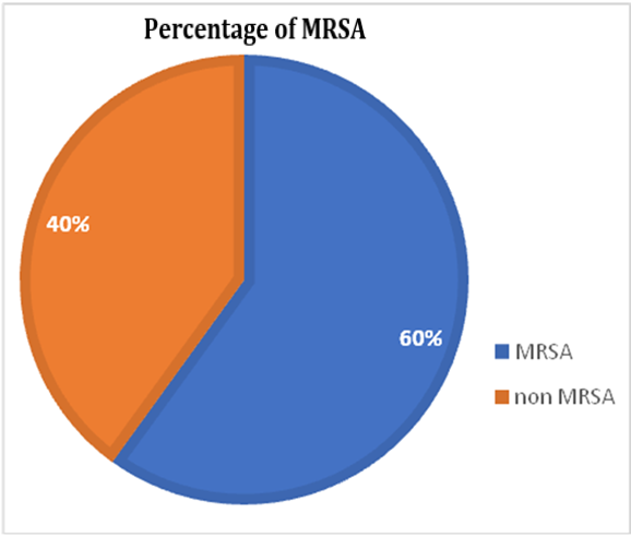 In our study, amongst hundred Staphylococcus aureus isolates, sixty isolates were shown resistance to cefoxitin (30µg), which indicates that percentage of methicillin-resistant s. aureus in our study is 60 (60%) (fig. 1).