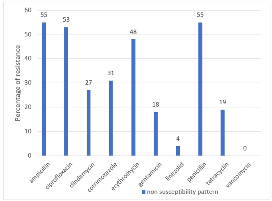 Among 60 methicillin-resistant Staphylococcus aureus isolates, 55(91.7%) isolates were resistant to ampicillin and penicillin, 53(88.3%) isolates were resistant were ciprofloxacin, 27(45%) isolates were resistant to clindamycin, 31(51.7%) isolates were resistant to cotrimoxazole, 48 isolates were resistant to erythromycin, 18 isolates were resistant to gentamicin, 4 isolates were resistant to linezolid, 19 isolates were resistant to tetracycline and All isolates were sensitive to vancomycin by disc diffusion test as per CLSI guidelines 2021 (fig. 2).