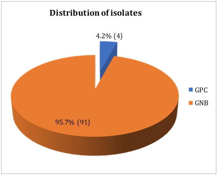 Out of the 250 samples, culture positive were 34.8% (n=87) and culture negative were 65.2% (n=163). Out of 87 culture-positive samples, polymicrobial growth was observed in 9.19% (n=8) and monomicrobial growth was observed in 90.8% (n=79). Majority of organisms isolated were Gram-negative bacilli 95.7% (n=91) and gram-positive cocci isolates are 4.2% (n=4) (fig 1).