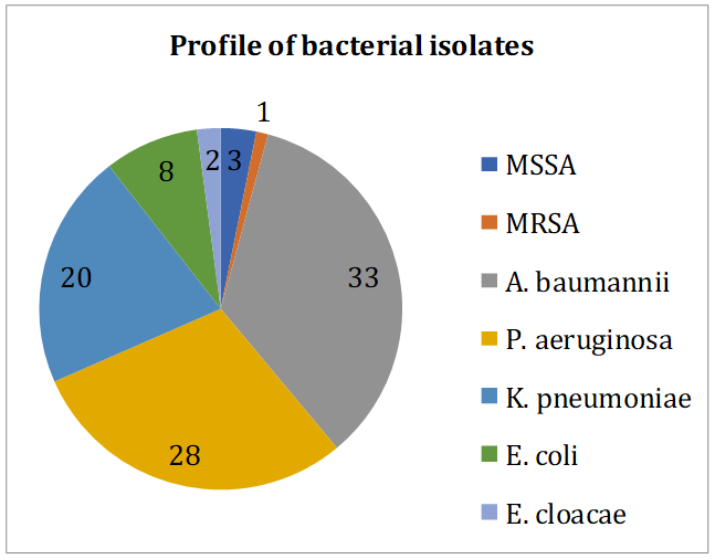 Among Gram-negative organisms isolated, A. baumannii is the most common isolate 34.7% (n=33), followed by P. aeruginosa 29.5% (n=28) and K. pneumoniae 21% (n=20). E. coli8.4% (n=8) and E. cloacae2.1% (n=2). Out of 4 Gram-positive organisms isolated, Methicillin Sensitive Staphylococcus aureus (MSSA) were 3.1%(n=3), and Methicillin-Resistant Staphylococcus aureus (MRSA) were 1.1%(n=1) (fig. 2).