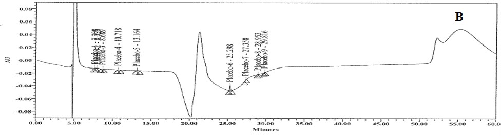 System suitability parameters were calculated according to USP guidelines to confirm the adequacy of the chromatographic system for analysis. A system-suitability solution was prepared using the standard mixture solution of cyclophosphamide and its related substances, following the established method. This solution was injected six times into the HPLC system, and the results are presented in table 1. The developed method demonstrated theoretical plates exceeding 2000 and a tailing factor less than 2 for cyclophosphamide and its related substances. Additionally, the %RSD of the peak area was below 5, indicating the suitability of the developed method and the excellent performance of the chromatographic system.