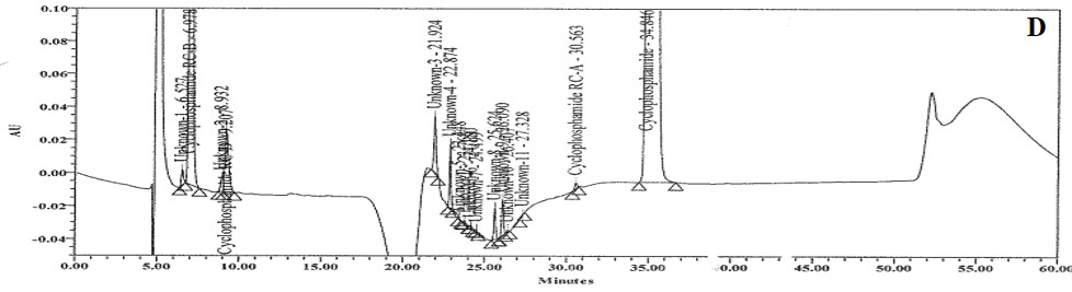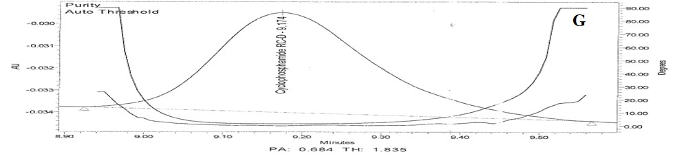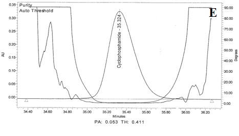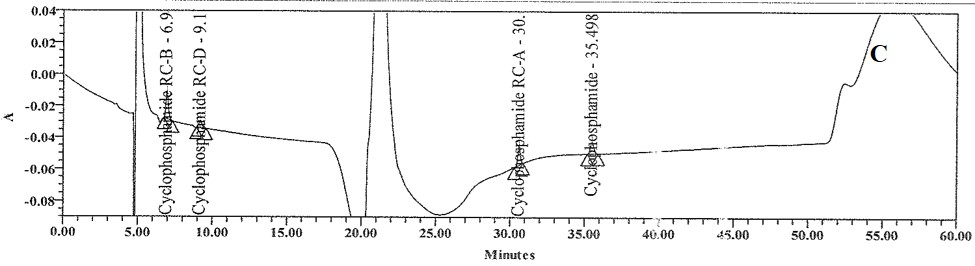The samples subjected to various forced degradation conditions showed well-separated chromatograms of cyclophosphamide and its related substances at different retention times (fig. 3 and 4). Cyclophosphamide and its related substances peaks are homogeneous, and there are no co-eluting peaks. No interference is observed at the retention time of peaks due to cyclophosphamide and its related substances. Comparable mass balance is achieved for assays and related substances (tables 9 and 10).