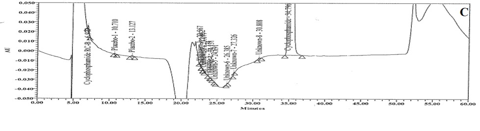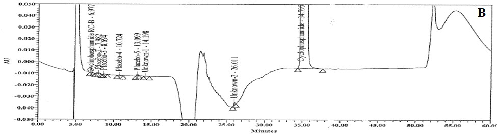 Conclusion: The developed analytical method is simple, precise, and reproducible and thus can be used for the stability-indicating analysis of cyclophosphamide and its related substances in pharmaceutical formulations.