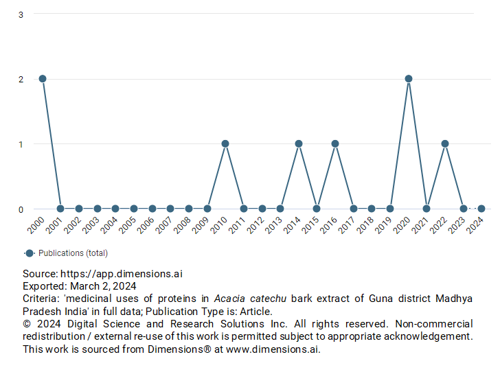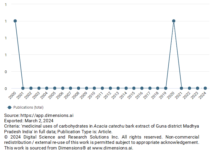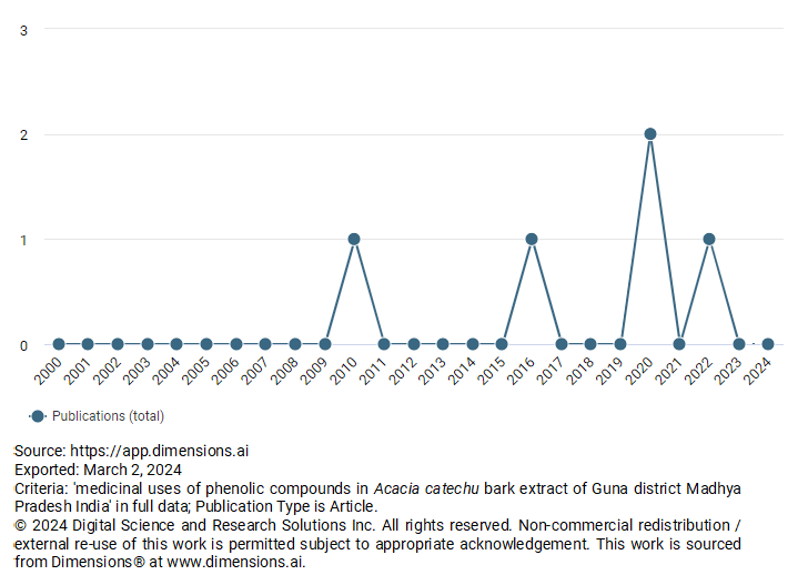 Here, our aim was to analyze the overall number of publications on the medicinal uses of studied phytochemicals of bark extracts of Acacia catechu with reference to the plants of Guna district. For this, the dimensions database was used as the primary source of research publications. Data on the number of research articles per year was collected from 2000 to March 2nd, 2024 (at 8 p. m.) using keywords like ‘medicinal uses of phenolic compounds in Acacia catechu bark extract of Guna district Madhya Pradesh India’, ‘medicinal uses of protein in Acacia catechu bark extract of Guna district Madhya Pradesh India’, ‘medicinal uses of carbohydrates in Acacia catechu bark extract of Guna district Madhya Pradesh India’ [16, 17].