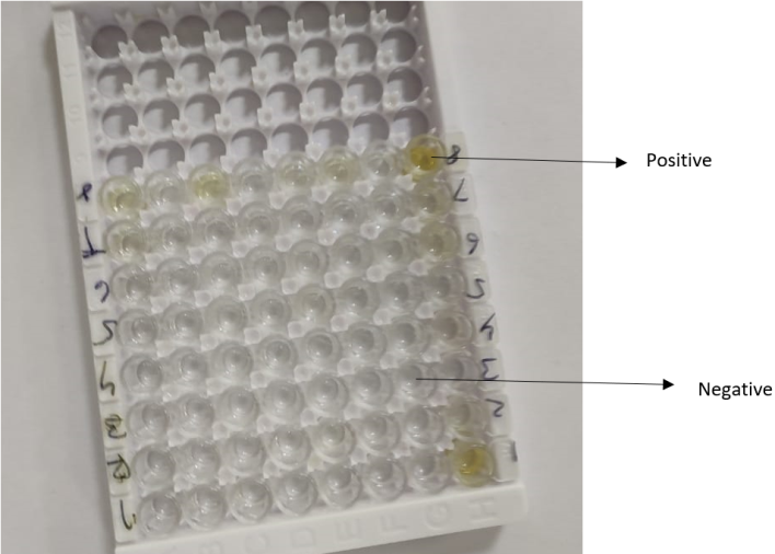 Fig. 1: ELISA plate showing positive and negative result for scrub typhus