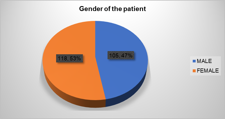 During the study period, a total of 755 cases were tested for scrub typhus, out of which 223 (29.5%) were positive. Out of 223 positive patients for scrub typhus., 105 (47%) were males and 118 (53%) were females.