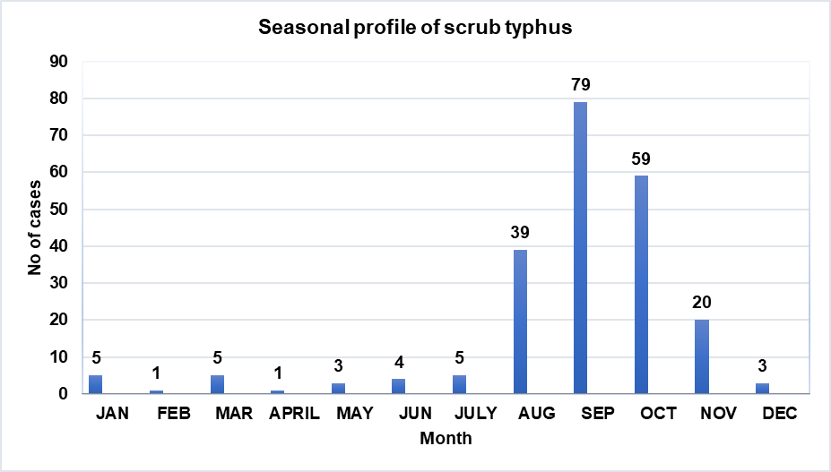 The maximum number of cases is in September (35.4%). Maximum clustering of cases seen during the autumn season, starting from September to November, accounting for 80.8% of the total cases.