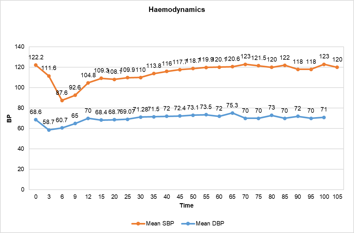 Fig. 2: Mean SBP and DBP plotted against time in minutes