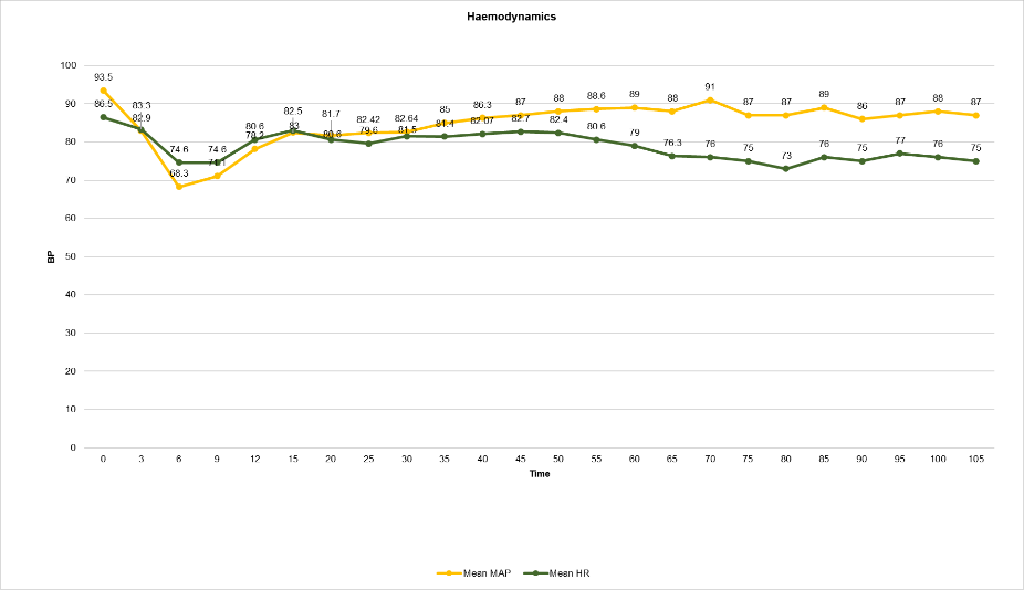 Fig. 3: Mean MAP and HR plotted against time in minutes