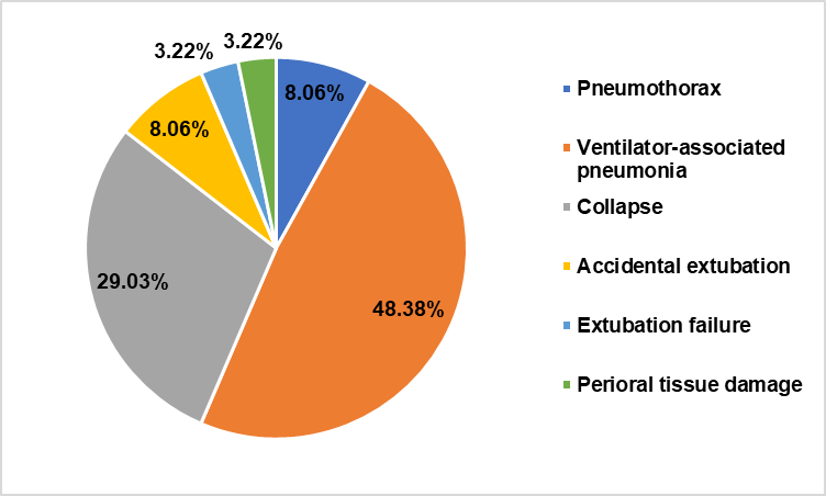In the present study, the complication rate was found to be 37.58%. The complications including ventilator-associated pneumonia (48.38%), collapse (29.03%), pneumothorax (8.06%), accidental extubation (8.06%), extubation failure (3.22%), and perioral tissue damage (3.22%). Similar rates of complications were shown in previous reports [14-16]. However, complications vary in these reports, the possible reason may be the type of mechanical ventilation device used, study population, and duration of mechanical ventilation.
