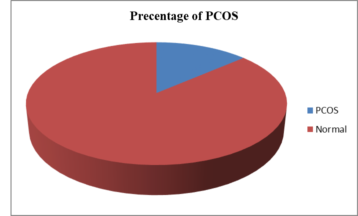 This prospective study is conducted in Navodaya Group of Institutions, Raichur. The study comprises of 500 girl students in the age group between 13-25. Among the 500 screened individuals, 13.6% have PCOS and 86.45 have no PCOS (table 1 and fig. 1) and majority of the students were in the age group of 18-20 (table 2). More cases of PCOS was reported in the age group 21-23 y, followed by 18-20 y; however, the results were insignificant (table 3). Majority of the PCOS patients were reported with Oligomenorrhea (table 4) nearly 60 cases out of 64 cases. It was observed that mean age of PCOS cases was 19.85 y and normal subjects were 19.95. There was no significant difference in the mean age between PCOS and normal subjects. mean height of PCOS cases was 160.18 cms and normal subjects was 159.49 cms. There was no significant difference in the mean height among PCOS and normal subjects mean weight of PCOS cases was 61.94 and Normal subjects was 56.91. There was significant difference in the mean weight among PCOS and Normal subjects. I. e. PCOS cases weight was high than Normal subjects. Similarly, mean BMI, mean Waist circumference and WHR was higher in PCOS cases than normal subjects. This difference was statistically significant (table 5 and table 6).