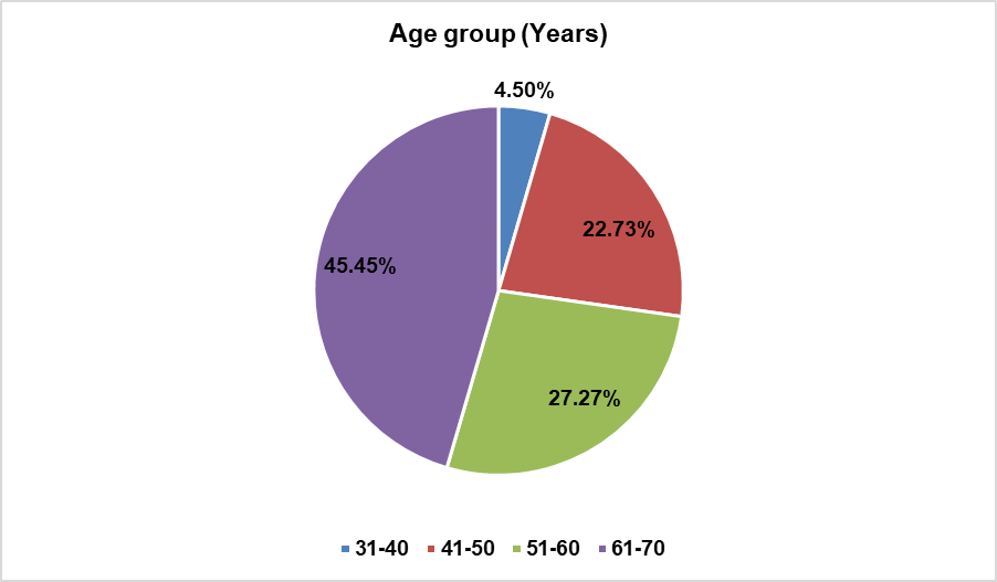 Fig. 1: Age group (Y), In this diagram, patients between 31-40 y were 4.50%, 41-50 y were 22.73%, 51-60 y were 27.27%, and 61-70 y were 45.45%