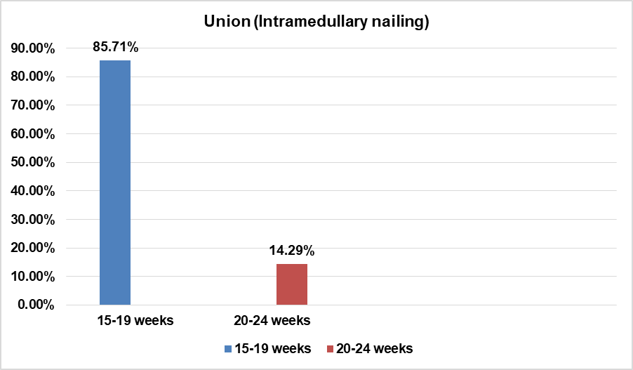 Fig. 3: Union (Intramedullary nailing), In this study, the intramedullary nailing group shows an average union at 18.5 w in which 85.71% of cases show a union at 15-19 w and 14.29% of cases show a union between 20-24 w