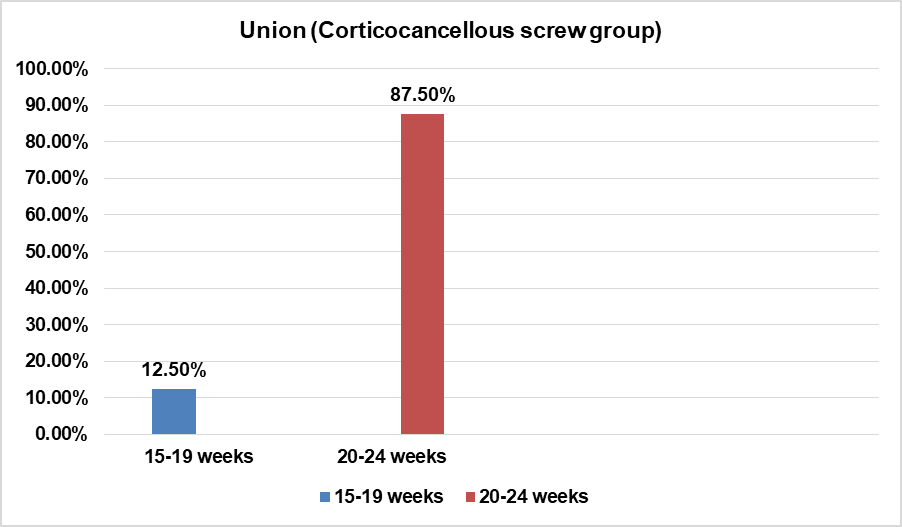 Fig. 4: Union (corticocancellous screw group), in this study, the corticocancellous screw group shows average union at 20.5 w in which 12.50% of cases show union at 15-19 w and 87.50% of cases show union between 20-24 w