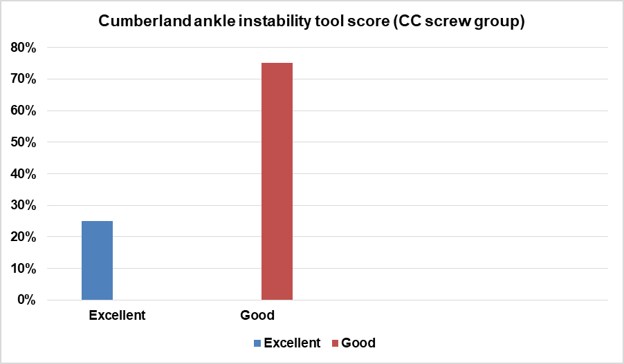 Fig. 6: Cumberland ankle instability tool score (Cc screw group), in the CC screw group the Cumberland Ankle Instability Tool average score of 27.5, excellent in 25% of patients and good in 75% of patients