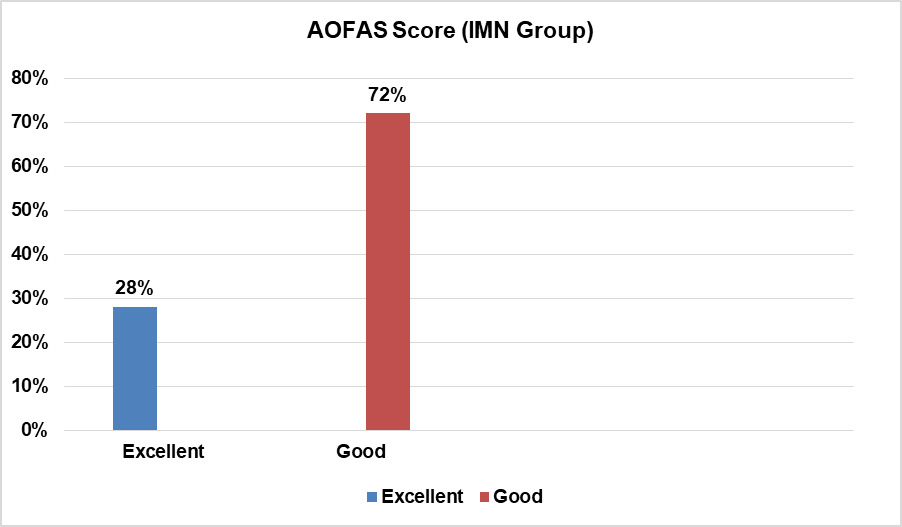 Fig. 7: AOFAS score (IMN Group), In the IMN group the mean American Orthopedic Foot and Ankle Society score of 83.25, excellent in 28% of patients and good in 72% of patients