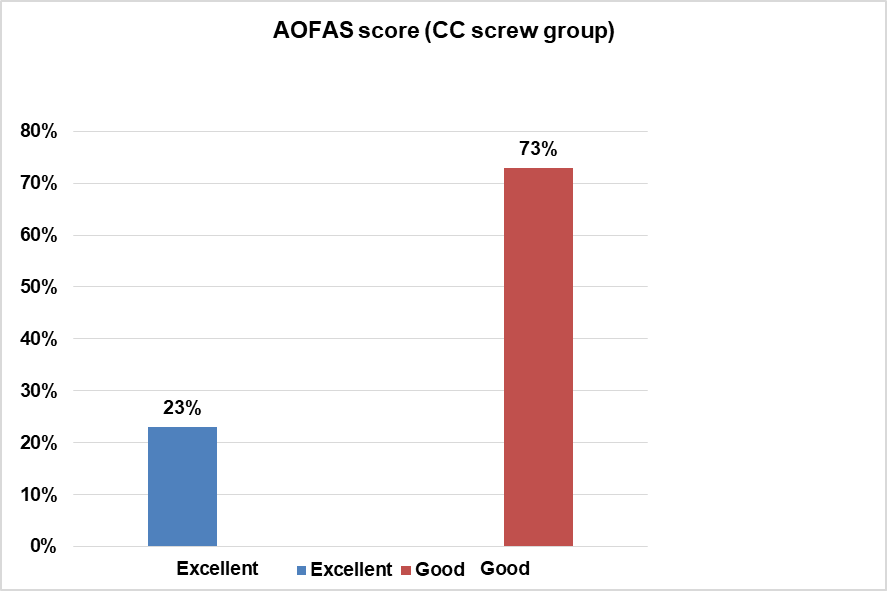 Fig. 8: AOFAS score (CC screw group), in the CC screw group the mean American Orthopedic Foot and Ankle Society score of 80.50, excellent in 23% of patients and good in 77% of patients