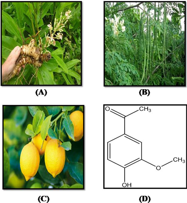 Fig. 1: Herbal components of formulation (A) A. galanga (B) M. oleifera (C) C. limon (D) Apocynin