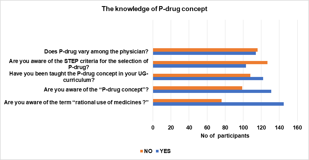 63% of participants were aware of the “rational use of medicines,” and around 57% of them knew about the P-drug concept. 44.8% were aware of STEP criteria which is applied to select P-drug (fig. 1).