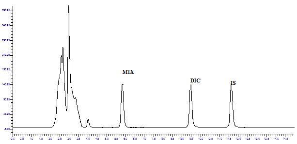 Fig. 2: The chromatograms of plasma spiked with drug mixture (MTX and DIC) and IS