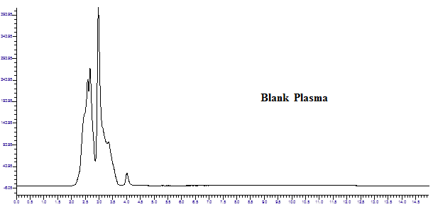The selectivity was studied by comparing the chromatograms of six different batches of plasma sample obtained from six independent lots of control plasma along with six extracted lOQ-QC samples. The method is selective if there is no interfering peak present at the retention time of the drug or IS.