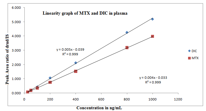 Conclusion: The developed method possesses good selectivity specificity, there was no interference found in the plasma blanks at retention times of MTX and DIC. We found good correlation between the peak area and concentration of the drug under prescribed conditions. Furthermore, the method can also be used to estimate the pharmacokinetic parameters of MTX and DIC simultaneously.