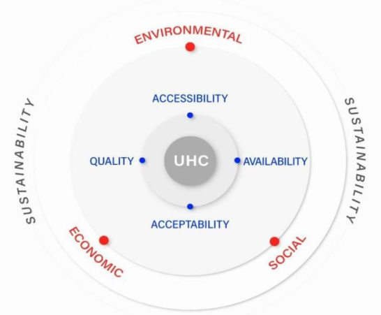 Objective: The organisation of the human society has undergone a unique transition throughout the last decades. With the rise of ever growing technologization and disruptive innovations, populations also demand more social and environmental initiatives from firms and governments. In 2015, the United Nations (UN) member states agreed upon a 2030 Agenda for Sustainable Development. Developing a sustainable UHC is decisive to ensure better economic prospects and social equality across socioeconomic classes. This can be achieved by lowering the barriers to access health services to the most vulnerable groups and improve mortality and disability rates in the potential workforce.