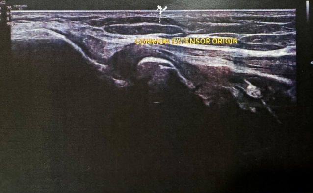 No evidence of any inflammatory changes seen in elbow joint region. There is a tiny well defined hypoechoic area approx 1.25 cms from the skin seen in proximal ECRB (extensor carpi radialis brevis).