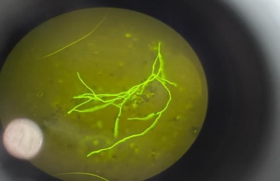 Fig. 10: Lactophenol cotton blue (LPCB) tease mount showing trichophyton rubrum, Microconidia-Tear shape, Macroconidia-long, narrow and thin walled (Pencil shape)