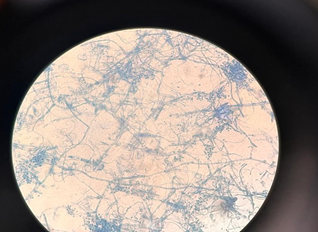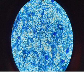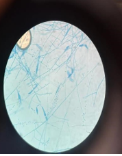 Fig. 8: Lactophenol cotton blue (LPCB), tease mount showing trichophyton mentagrophyte, microconidia-abundant, arranged in clusters along the hyphae macroconidia-elongated with blunt ends (cigar shape)
