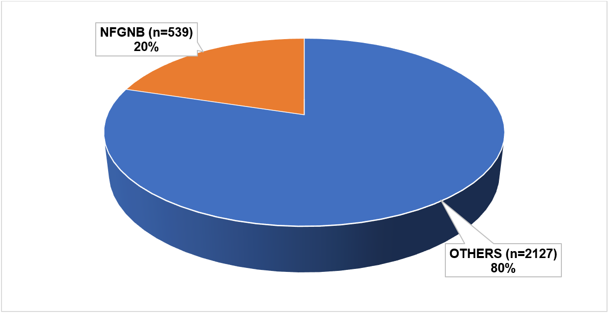 A total of 7875 samples were processed; among them 2666 samples showed culture positive, out of which NFGNB accounted for about 20% (539 samples) [fig. 1].