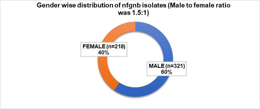 The isolation rate of NFGNB was highest among males (59.55%) compared to females (40.44%) fig. 2. Most common age group affected was 41-60 y (45%), 21-40 y (30%), 60-80 y (15%), 0-20 y (9%) and above 80 y (less than 1%).