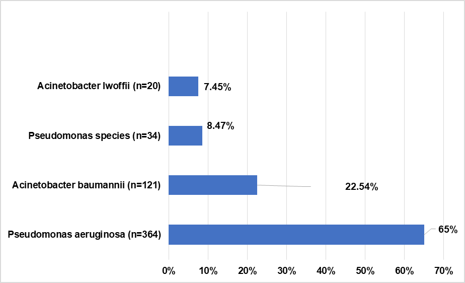 In present study, predominant isolate was Pseudomonas aeruginosa (65%) followed by Acinetobacter baumannii (22.54%). These results were corroborated with the study conducted by Soni et al. (2023) [12], where Pseudomonas aeruginosa (51.7%) was the most common NFGNB isolate followed by Acinetobacter baumannii (23.4%). Studies by Ami Patel et al. (2021) [14], Anshu shastri et al. (2019) [4], Anu Sharma et al. (2018) [18], Grewal et al. (2017)[19], Juyal et al. (2013) [20] also reported Pseudomonas aeruginosa as the most predominant isolate followed by Acinetobacter baumannii. In contrast to the present study, studies by Sharma et al. (2020) [11], Yadav et al. (2020) [13] reported Acinetobacter baumannii as the most common isolate followed by Pseudomonas aeruginosa.
