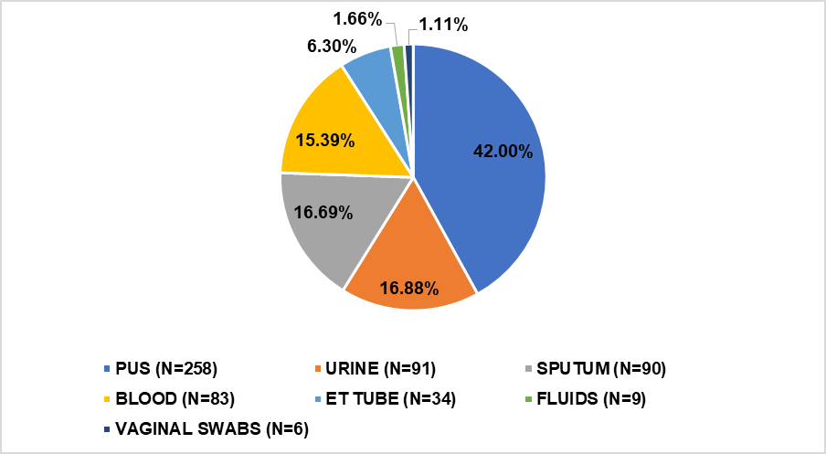 Majority of NFGNB isolates were obtained from pus samples (42%). These results are in concordance with the findings obtained by Soni et al., Benachinmardi et al. (2014) [21], where highest NFGNB isolates were from pus samples compared to other clinical samples.