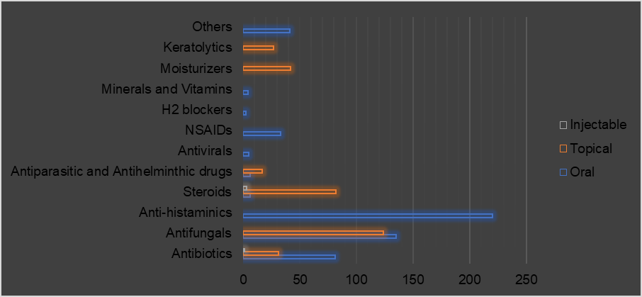 Antifungals were the most prescribed drugs (31.6%) followed by antihistaminics (27.1%), Antibiotics (13.4%), Steroids (11.5%), NSAIDs (4.77%) and Moisturisers (4%). Flucanazole was commonly prescribed antifungal via topical route. Among antihistaminics Levocetrizine, Cetrizine, Chlorpheniramine were most commonly pescribed via oral route. Some of the topical antibiotics prescribed were Fusidic acis amd Clindamycin. 93.2% of prescribed steroids were via topical route. A total of 35 moistirisers 22 keratolytics were prescribed via topical route only. A total of 5 antiviral agents and 39 NSAIDs were prescribed via oral route (table 4, 5).