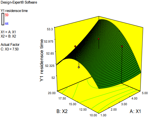 Y1 residence time =+19.04655+1.09569*X1+0.70655*X2+5.11310*X3-0.050000*X1*X2-0.20000*X1*X3-0.030000*X2*X3+0.021552*X12-0.016552*X22-0.14621*X32+1.00000E-002 * X1 * X2 * X3