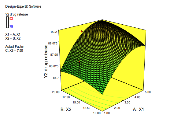 Y2 % drug release =+91.84750+0.42000 * X1+0.21000 * X2-0.47000 * X3+0.100000 * X1 * X2+0.35000 *X1 *X3+0.030000 *X2 * X3-0.28750 * X12-0.014000 * X22-0.13600 * X32-1.00000E-002 * X1 * X2 *X3