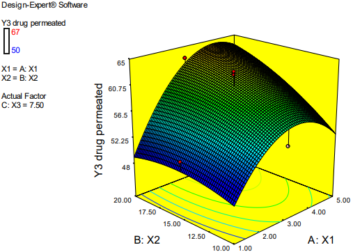 % drug permeated (Y3) =+36.51+11.28 * X1+2.97 *X2+1.49 * X3+0.79 * X1 *X2+1.04 * X1 * X3-0.49 * X2 * X3-3.18* X12+0.50* X22+0.077* X32