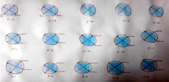 Every spray formulation was sprayed from the device used in the spray pattern test, and the spray pattern was noted on treated paper. The ovality ratio was calculated by measuring the spray portion's minimum and maximum diameters for every spray formulation [16]. As seen in fig. 4, the spray pattern that was observed was circular, meaning that the ovality ratio was close to 1. The priming test results were comparable to those of the preliminary tests; that is, formulations FF1–FF6, FF9–FF10, FF14–FF16, and those with higher amounts of poloxamer 188 X3 and propylene glycol X2 took three primes to emit, while formulations with lower amounts emittedat the conclusion of the two primes. RIS content per shot ranged from 88 to 102% in the test for material released in a single shot. Handling errors and variations in the amount of product emitted per shot could be the cause of this content disparity. Nonetheless, the outcomes demonstrated that every spray device operated as intended [17]. According to table 2, all of the formulations, F1 through F16, had acceptable spray profiling, indicating that the formulations were properly formulated and in a homogeneous solution state. The valve assembly's proper operation served as more evidence for this. During product usage, uniform spray shots at the beginning, midway and tail off states guaranteed accurate and repeatable dose emission. The spray angle for formulas FF1 through FF16 ranged from 50 to 69°θ. The variation in these recipes' uniformity as well as the components of the device caused this spray angle discrepancy. Nonetheless, all formulation devices yielded spray angles that were suitable for applying to the sublingual mucosal surface [15].