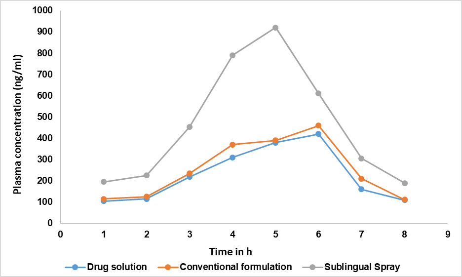 | Parameters | Drug solution | Conventional formulation | Sublingual spray formulation |
