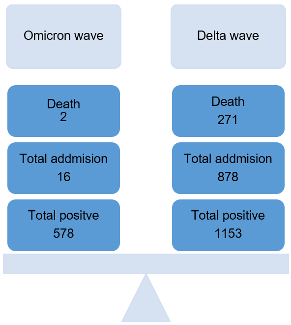 Conclusion: The hospital admissions were very low in comparison to delta wave. During delta wave, the degree of severity and number of deaths were also very high.