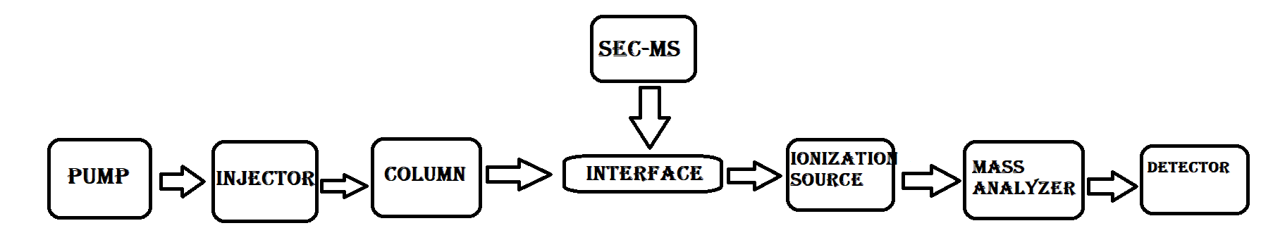 When SEC and MS are combined, the emitted constituents via the SEC are immediately injected into the mass spectrometer for analysis. This can be done via a variety of interactions, such as the electrospray ionization (ESI) depending on the analytes and the mass spectrometer being utilized.