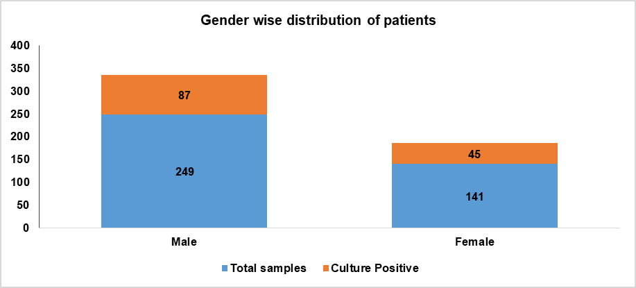 A Total of 390 Pus/wound discharge samples were processed; among them 132 samples were culture positive, out of which the isolation rate was highest among males(65.9%) compared to females (34.1%) [fig. 1].