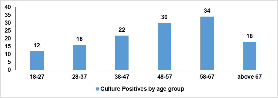 Fig. 2: Age-wise distribution of patients, majority of culture positives were from General surgery followed by Obstetrics and Gynecology, Orthopedics, ENT, Plastic surgery, Neurosurgery [fig. 3]