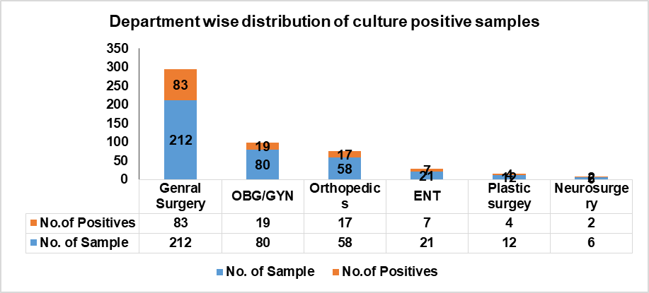 A total of 390 pus/wound discharge samples were tested out of which 132 samples were culture positive. The prevalence of SSIs in this study was 34%, which is in correlation with other studies (Prakash patel et al.) [7]. The occurrence of SSIs in developing countries has been reported to be around 2-40% [8]. In our study, the maximum rate of infection was from General surgery followed by Obstetrics and Gynecology, Orthopedics which is corresponding to the study by Nirupa et al. [9] and in contrast to the study by Ambreen shafaat khan et al. showed maximum from Orthopedics followed by Obstetrics and Gynecology and General surgery [5].