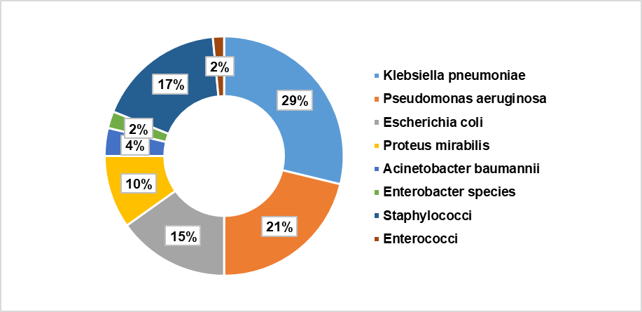 Results: Out of 390 pus/wound discharge samples processed, 132 (34%) samples were culture positive, among which 107 (81%) were Gram-negative bacilli and 25 (19%) were Gram-positive cocci. Male to female ratio was 2:1. Most common age group affected was>50yrs. Predominant isolates were Klebsiella pneumoniae (73.47%) followed by Pseudomonas aeruginosa (26.53%) and Staphylococcus aureus (17.4%). Gram-negative bacilli showed maximum susceptibility to Imipenam, Piperacillin-Tazobactam and Amikacin and Gram-positive cocci showed 100% to Linezolid, Vancomycin.